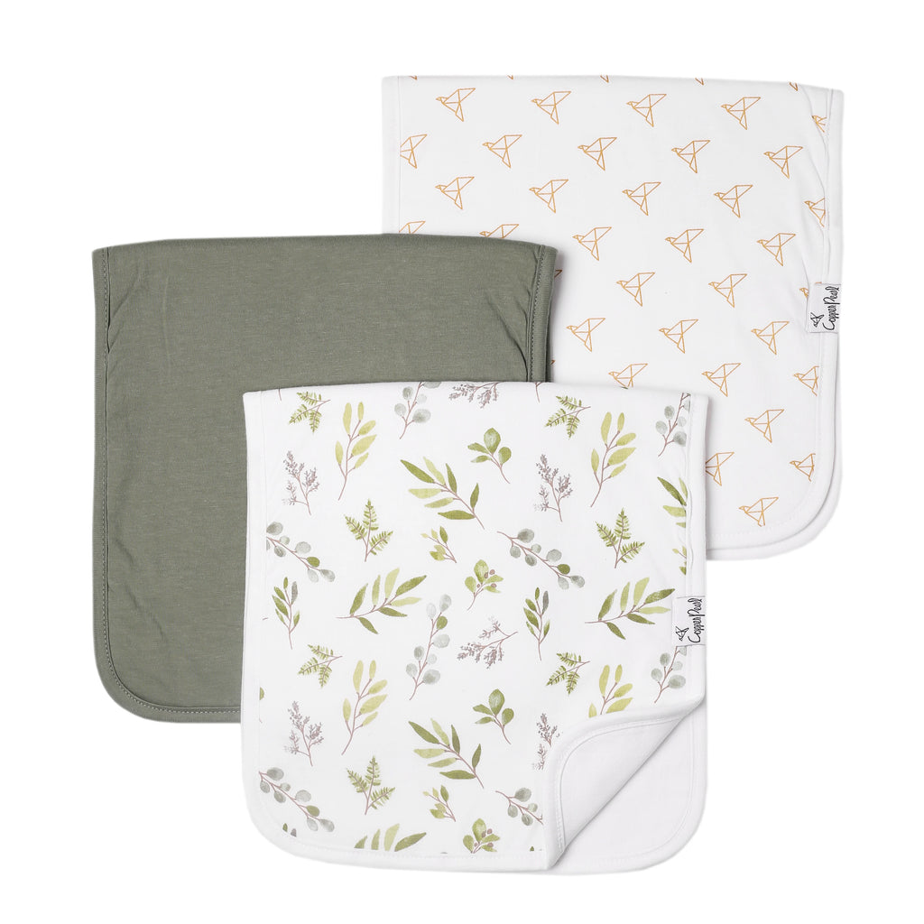 Copper Pearl burp cloths come in a generous 21x10 inch size, providing greater shoulder coverage (and less outfit changes) for Mom and Dad.